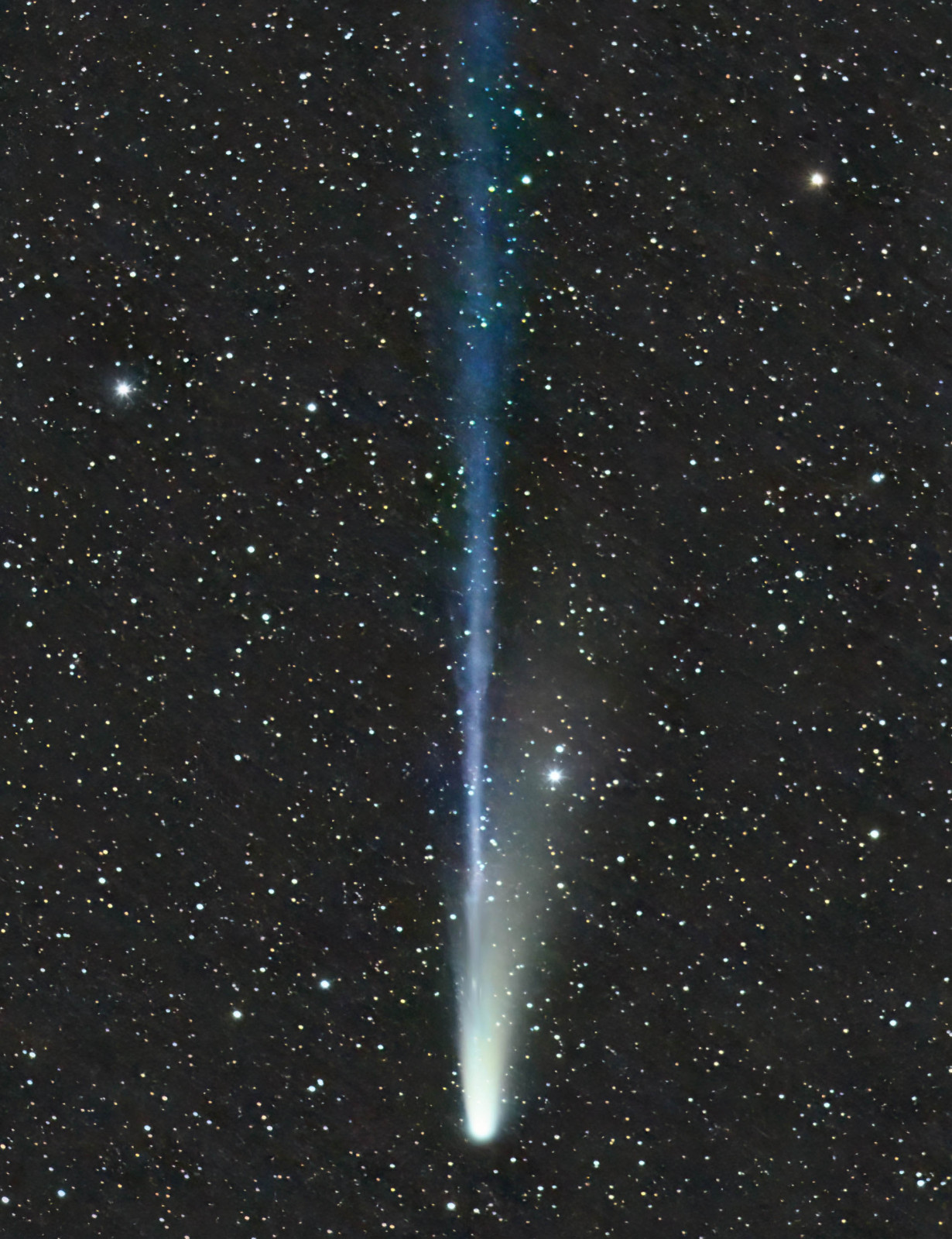 C/2025 A6 (Lemmon) is a non-periodic comet discovered by the Mount Lemmon Survey in images obtained on 3 January 2025. It has an inbound orbital period of about 1,350 years. Comet C/2023 A3 (Lemmon) observed on 10/26/2025. It makes its closest approach to Earth on 21 October 2025 and may be visible to the naked eye 42 degrees from the Sun after sunset. As of 25 October 2025, the comet is about apparent magnitude 4.3,[6] and the nucleus and coma are visible in binoculars about 15 degrees to the upper left of Arcturus. The green coma results from diatomic carbon (C₂) molecules excited by ultraviolet sunlight. The faint tail is dust and ionized gas pushed away by solar radiation and the solar wind.