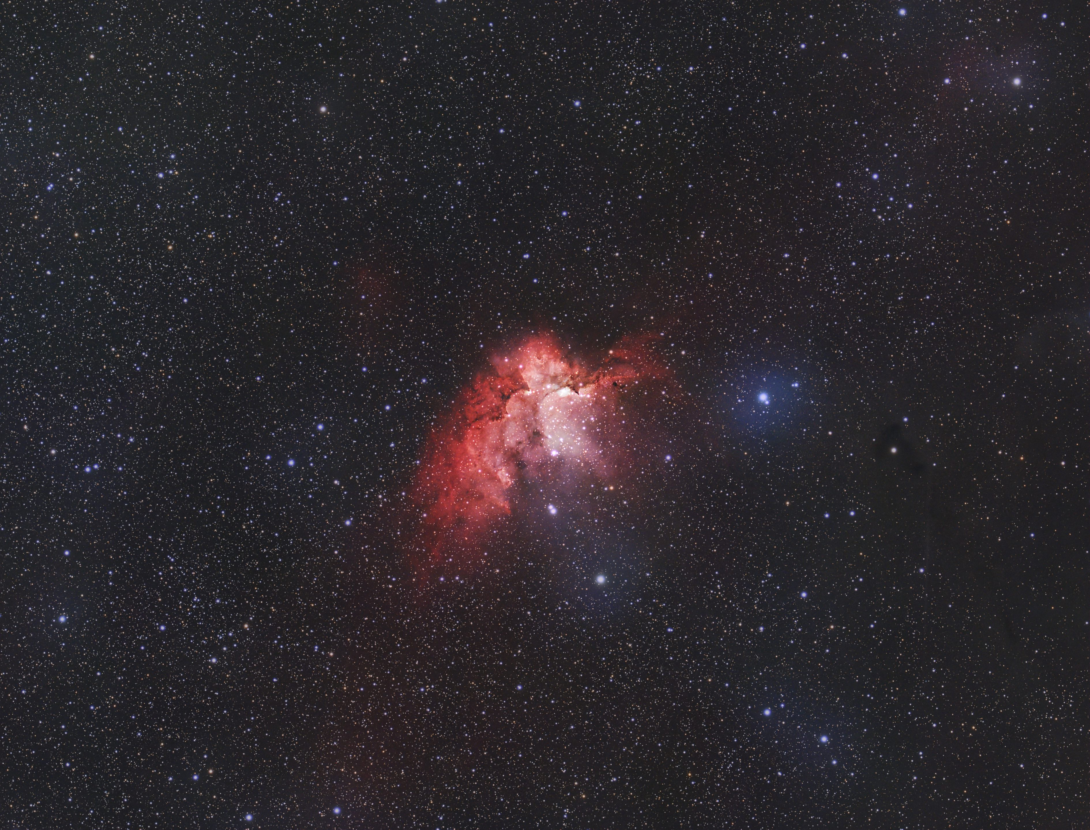 NGC 7380, often referred to as the Wizard Nebula, is an active star-forming region in the constellation Cepheus, located roughly 7,200 light-years from Earth. At its core lies a young open cluster whose massive, energetic stars flood the surrounding hydrogen gas with intense ultraviolet radiation. This radiation ionizes the nebula and sculpts its interior, creating bright emission regions interwoven with darker cavities where dust and gas have been cleared or compressed. The result is a complex structure of glowing gas, dense knots, and irregular boundaries that reflect the ongoing interaction between newborn stars and their parent molecular cloud.